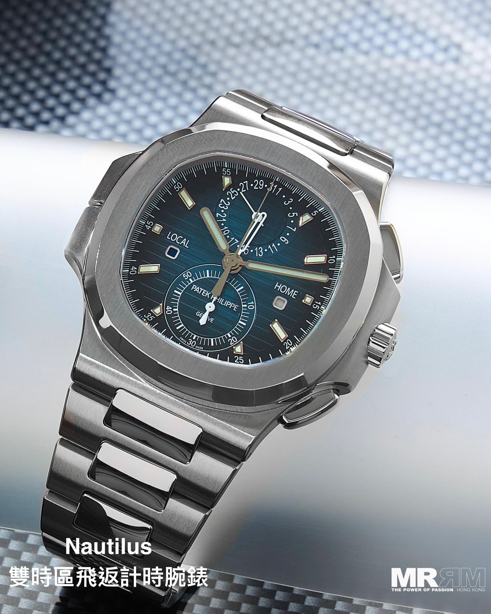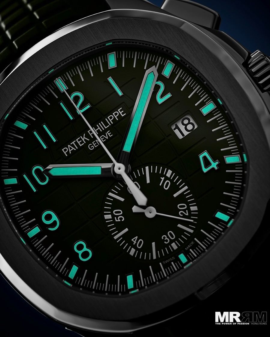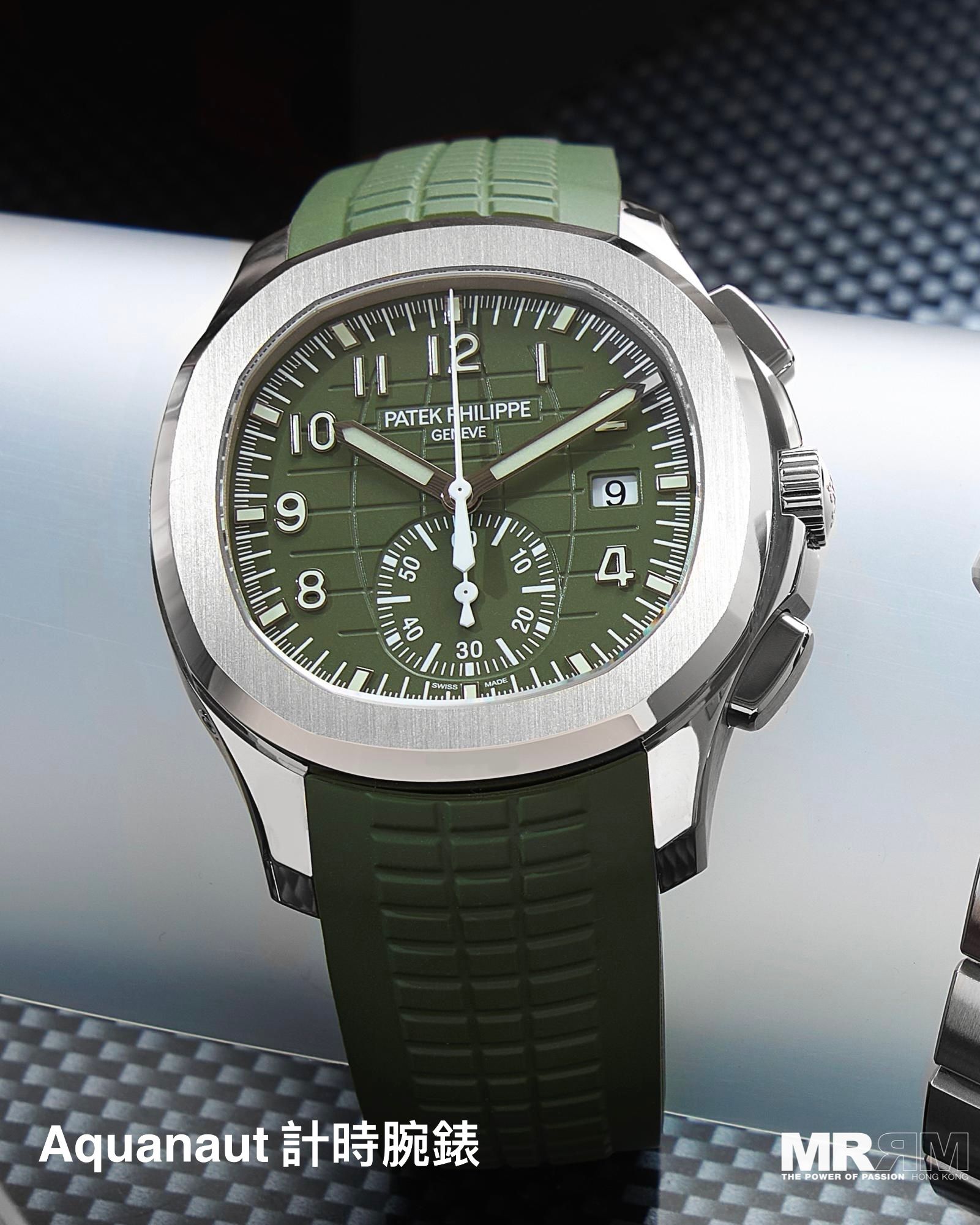 今次為大家帶來Patek Philippe 兩枚較為運動型的計時腕錶。第一枚為5968G-010 Aquanaut 計時腕錶。這枚錶以大膽的卡其綠色漆面錶盤與42.2毫米的18K白金錶殼形成鮮明對比,完美詮釋了Aquanaut系列的現代運動精神與敢於突破的個性。在標誌性的浮雕錶盤圖案上,計時副盤以純白色清晰呈現,讀時一目了然。覆有強效夜光塗層的大型白金數字時標與指針,確保在任何環境下都能極速讀取時間。內置自動上鏈機芯,配備飛返計時功能,不僅是一款極具辨識度的計時碼錶,更是一種滿活力與探險精神的生活態度。