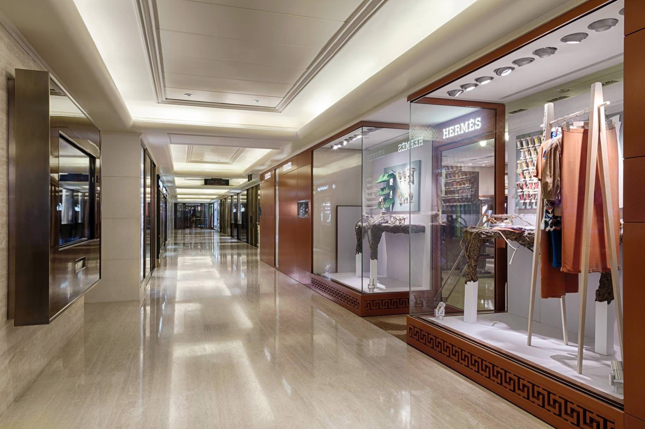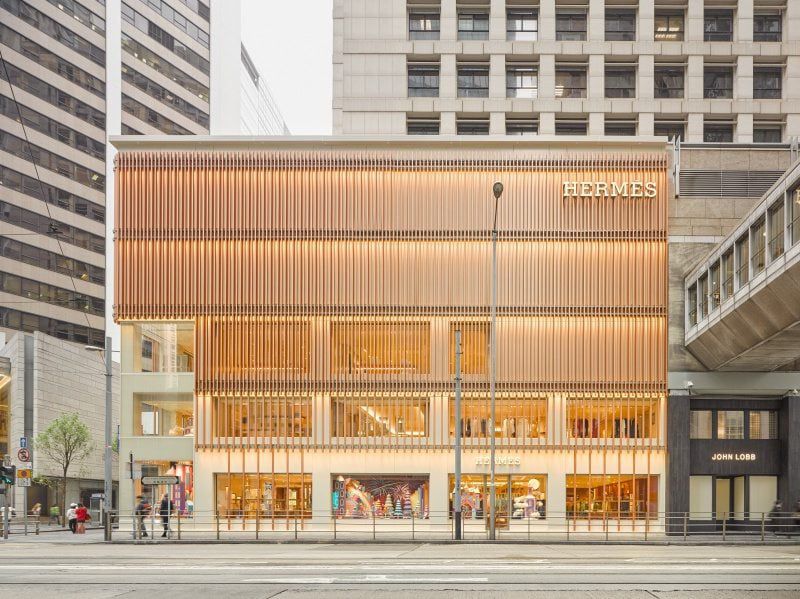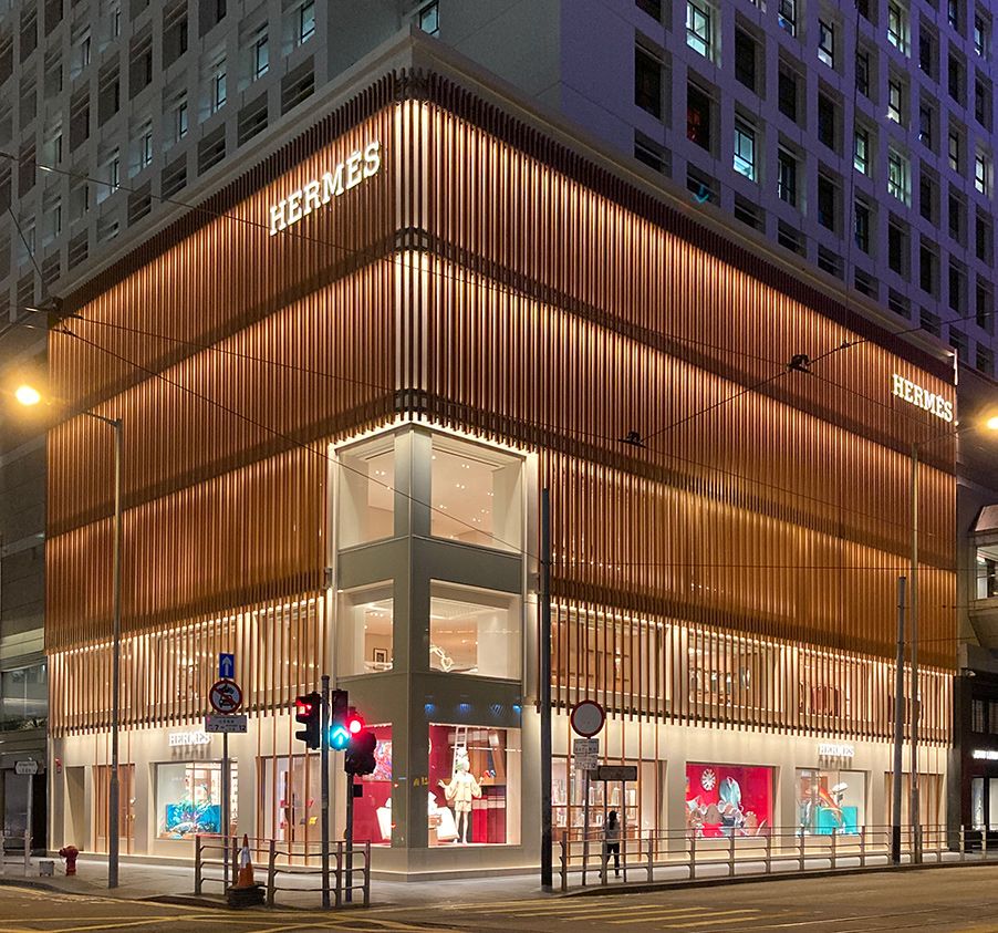 Hermès 目前位於中環置地太子大廈的旗艦店於2018年開幕,新店樓高三層,總面積逾9千平方呎。店舖設計由 Denis Montel 所帶領的巴黎建築師事務所 RDAI 操刀,特別融入香港本土元素——外牆的立面立體設計,靈感源自香港傳統竹製棚架工藝。